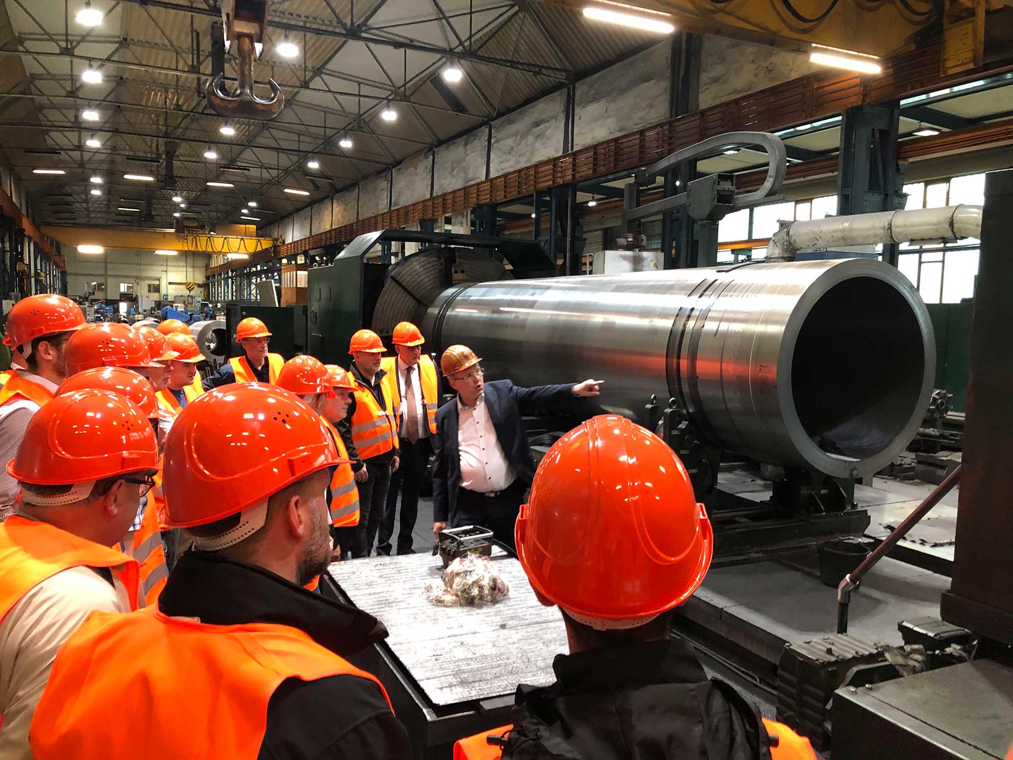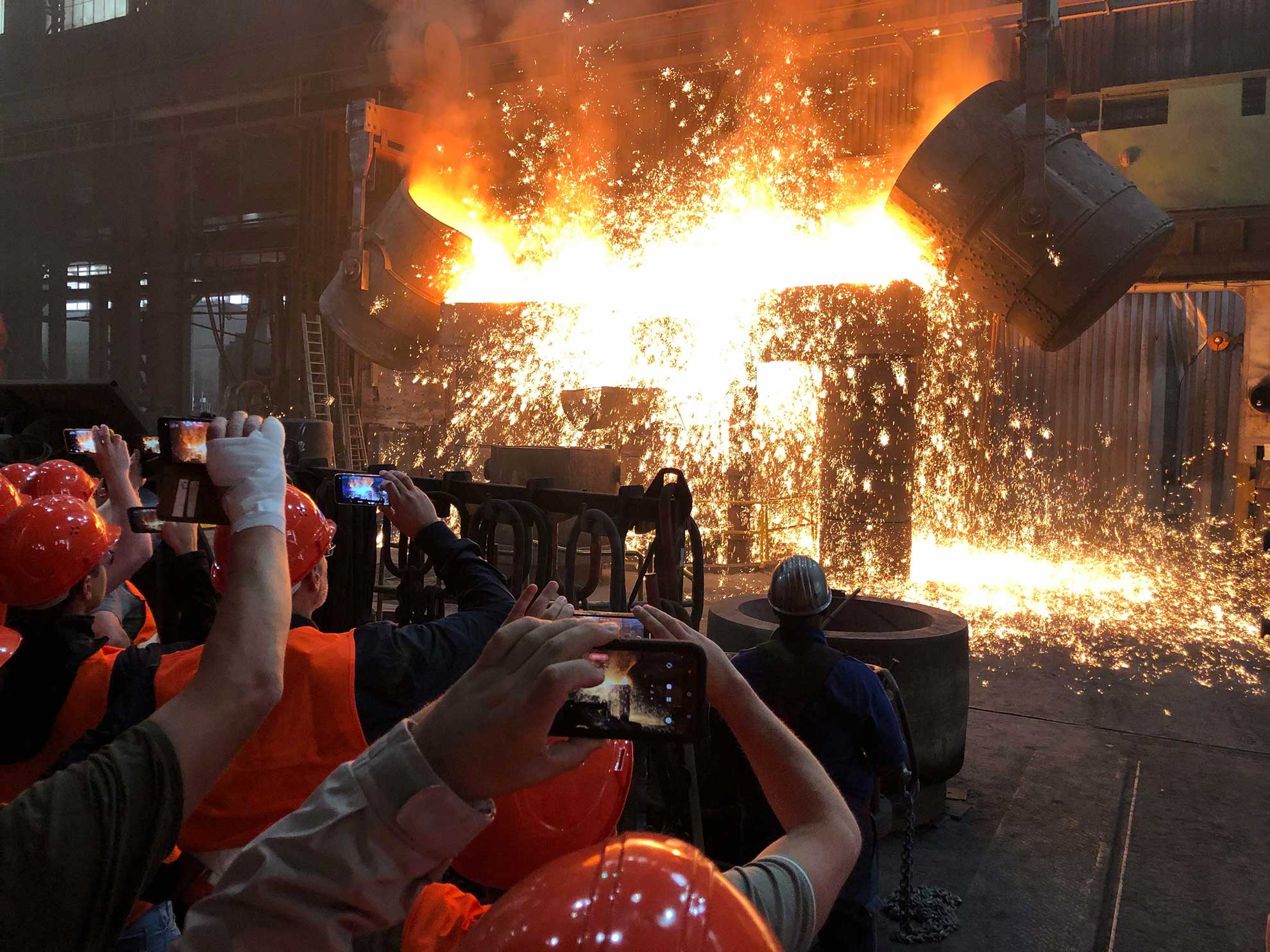 Eine Delegation des VDI Bodensee ist begeistert, den Abguss einer 70 Tonnen schweren Kalanderwalze im Hartgussverfahren live erleben zu dürfen.